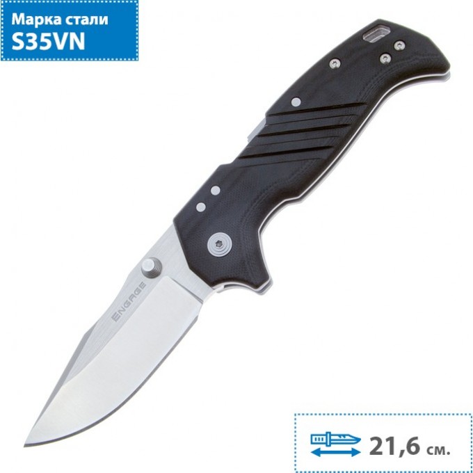 Cold Steel Engage — складной нож от Cold Steel. Эта модель отлично подходит для различных тяжёлых работ, обладает внушительным крепким клинком, который извлекается как с помощью шпенька, так и с помощью флиппера. Рукоять из G10 удобной для руки формы делает работу полностью безопасной и исключает соскальзывание руки на режущую кромку. Также в рукояти имеется отверстие для темляка. Нож использует замок Atlas Lock от Cold Steel.